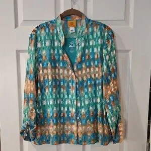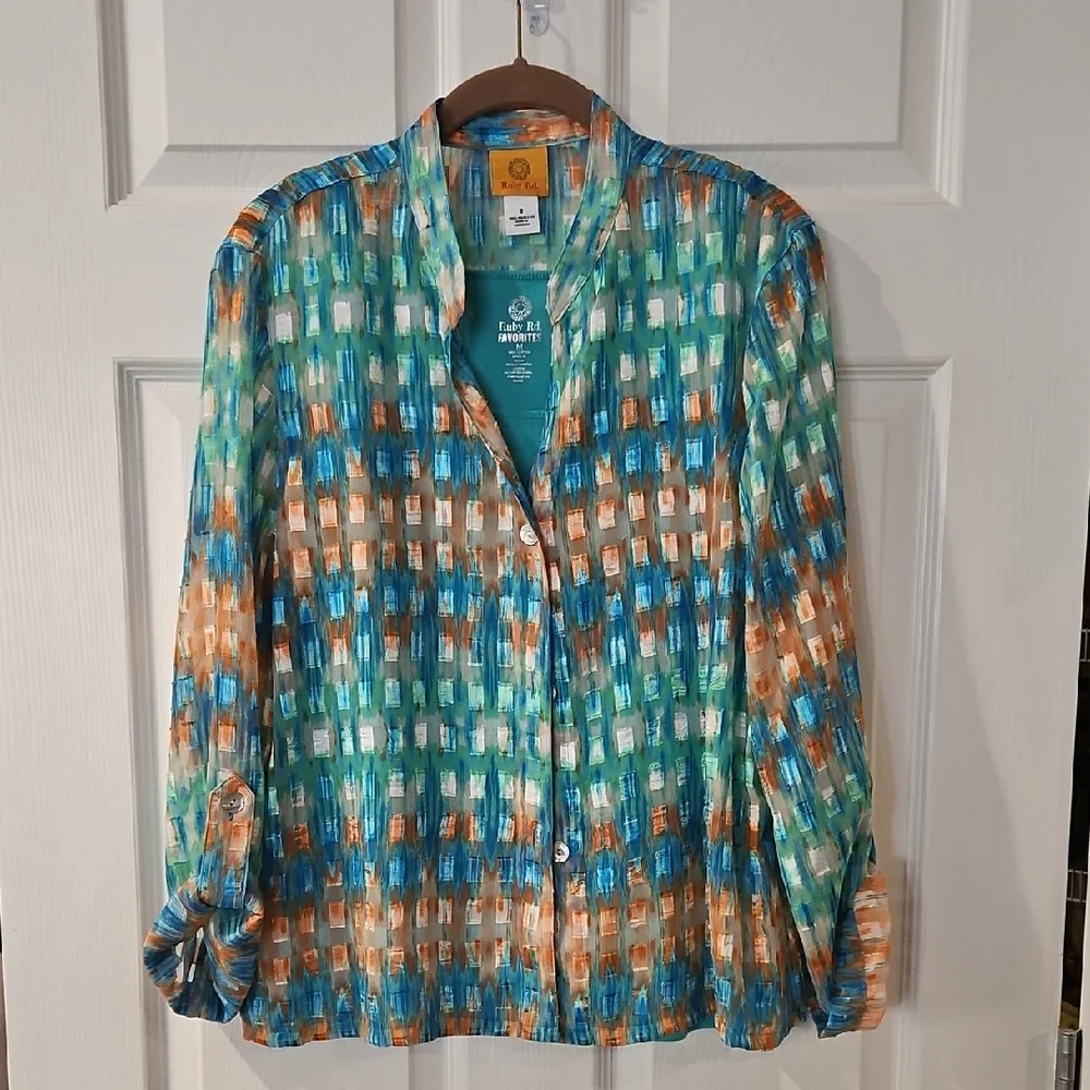 Stylish blouse with abstract patterns. Features blue, green, and orange hues. Solid blue tank to go underneath.