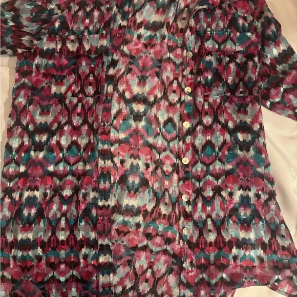 Stylish blouse with abstract design. Features pink, blue, and black hues.