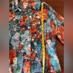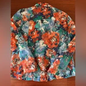 Abstract pattern blouse with button-up front. Features a mix of vibrant colors.