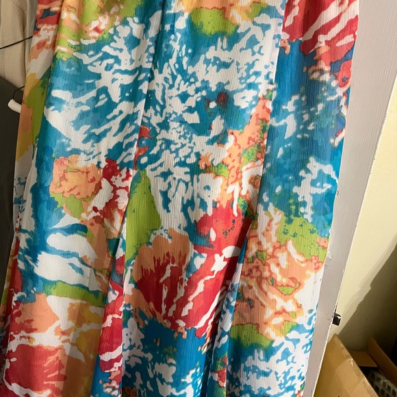 Bright abstract dress with splashes of blue, orange, and green. Lightweight and stylish.