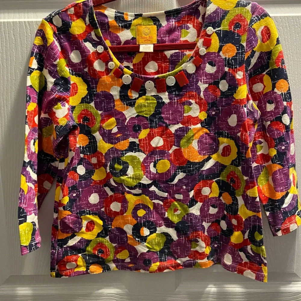Vibrant top with abstract patterns. Features bold colors for a striking look.