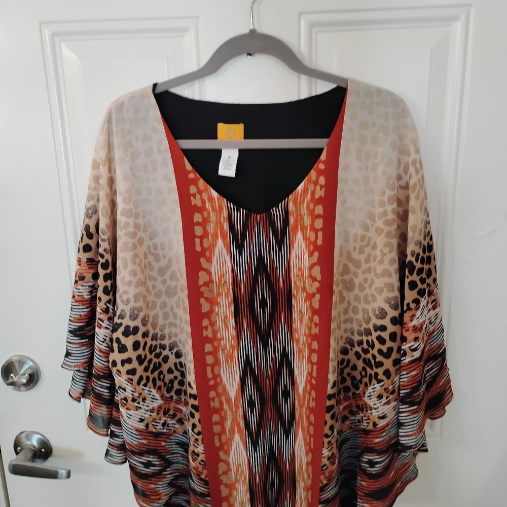 Stylish top with animal print. Features a mix of red, black, and tan colors. Flowy and comfortable design. V neck, Poncho style.