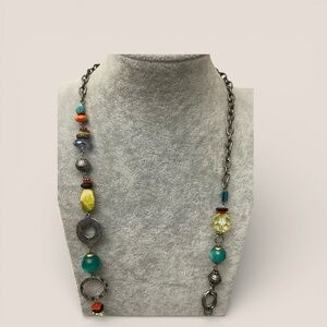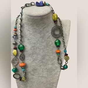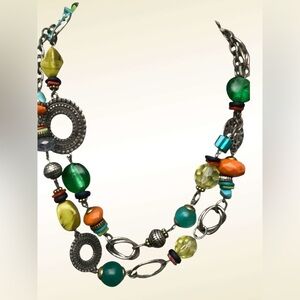 Vibrant necklace with green, yellow, orange, and silver beads. Unique design with mixed shapes. Perfect for adding flair.
