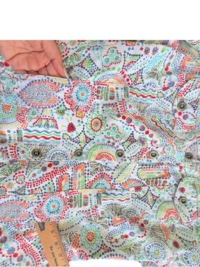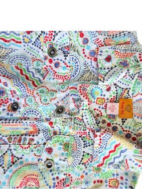 • Pattern: Vibrant multicolor abstract print (dots, waves, geometric motifs)