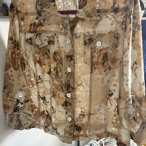 Stylish Ruby Rd. jacket/blouse with a multicolor fall pattern. Features button-up front and chest pockets with mother of pearl look buttons Roll up sleeves with button and straps. Perfect for casual wear.or dress up for dinner.