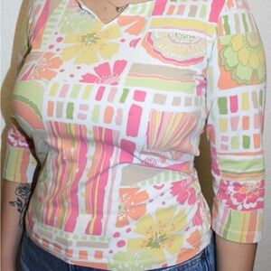 Cutest Ruby Rd. colorful 70s boho quarter sleeve top, flattering fit, comfortable material, size medium