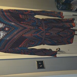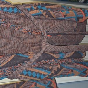 Vibrant knit cardigan with a mix of colors. Features an open front and cozy texture. Great with jeans and boots