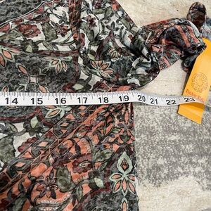 Stylish blouse with intricate patterns. Features a mix of colors. Perfect for casual wear. Lightweight and soft! NWT. Size medium.