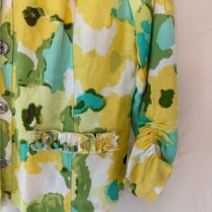Colorful top with a blend of yellow, green, and white. Lightweight and stylish.