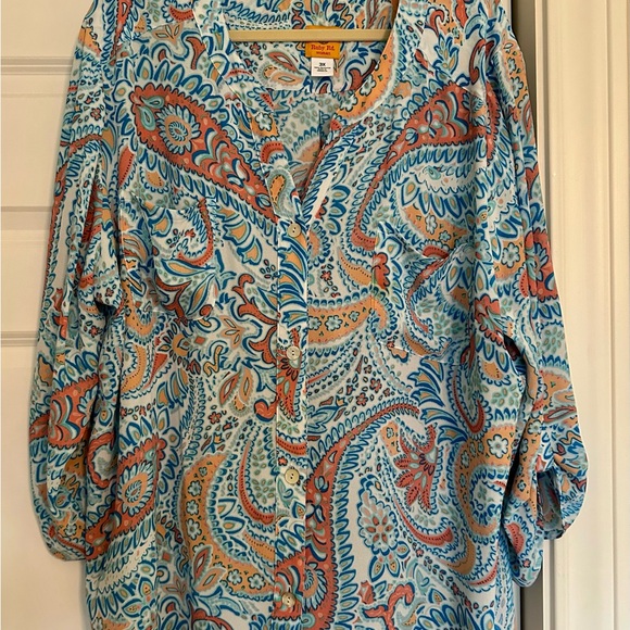 Elevate your wardrobe with this vibrant paisley print blouse. Featuring a blend of blue, orange, and white, this top is perfect for any occasion. Enjoy the comfort and style of this eye-catching piece. My weight loss is your gain. Price to sell. Whole closet clean out, please check out my other listings.