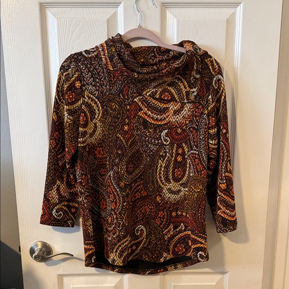 Stylish paisley blouse. Features rich multicolor design. Perfect for any occasion.