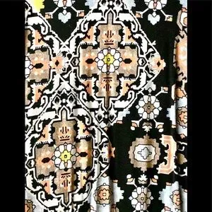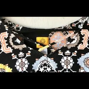 Rayon stretch knit top by Ruby Rd has an asymmetric Boho pattern in pastel peach, blue, yellow, tan and white colors, on a black background. Features criss-cross/lattice neckline, 3/4 sleeves, tapered hemline. Fabric content 95% rayon/5% spandex. Care: machine wash cold, gentle cycle; hang or lay flat to dry.