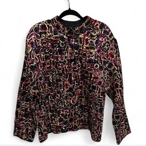 Vibrant jacket with intricate patterns. Features a mix of colors for a bold look. Perfect for adding flair to any outfit. Measurements in photos. Offers welcome 🫶🏼