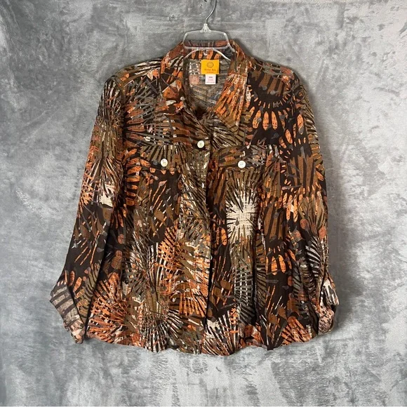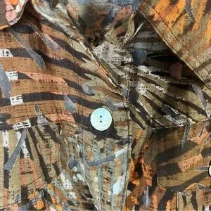 Vibrant jacket with multicolor pattern. Features unique design and button accents.