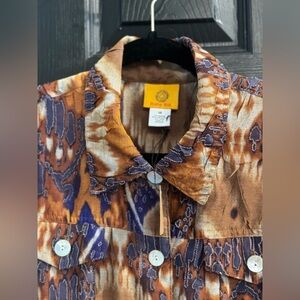 Vibrant shirt with a striking pattern. Features a mix of orange, blue, and brown tones. Perfect for a bold statement.