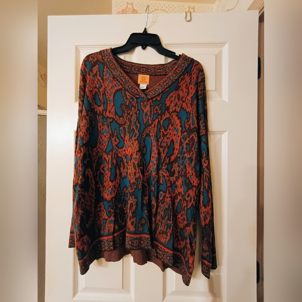 Striking Ruby Rd. sweater with intricate pattern. Features a mix of vibrant autumnal colors for a bold look. Ideal for casual wear. Size L. 100% Rayon. New with tags. Non-smoking home.