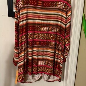 Stylish blouse with vibrant stripes. Features a mix of red, orange, and brown tones. Ideal for a bold look.