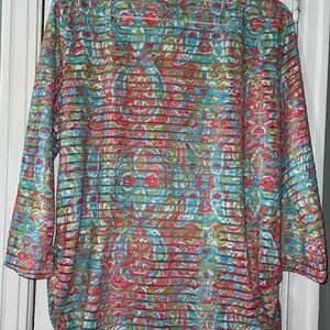 Chic blouse with vibrant stripes. Features red, green, and blue tones. Ideal for a stylish look.