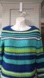 Vibrant striped sweater with fringe. Features blue, green, and yellow tones. Perfect for a bold look.