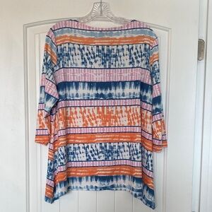 Vibrant tunic with orange, blue, and pink stripes. Ideal for casual wear. 3/4 length sleeves. Excellent condition, smoke free home.
