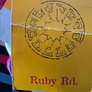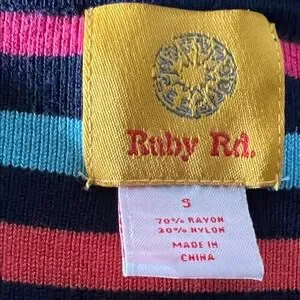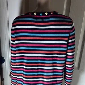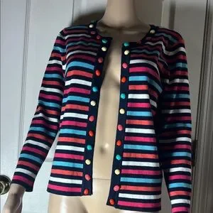 Ruby Rd. cardigan with bold horizontal stripes. Features navy trim and colorful button accents. Lightweight knit with vibrant color pops. Classic crew neckline and long sleeves. Easy to pair with casual or dress looks.
