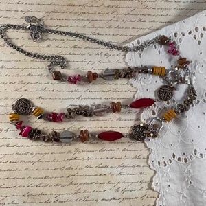 This is a Ruby Rd Necklace. Silver Tone with red, yellow and brown accent beads. It has a lobster clasp and the hangtag has Ruby Rd on it. It is 40" long with a 3 1/2" extension chain. Very pretty!