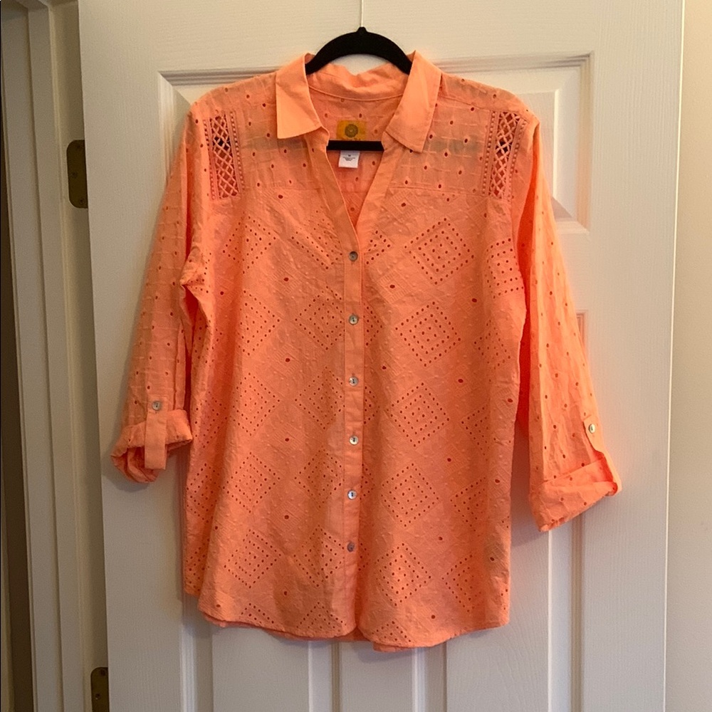 Elevate your style with this vibrant orange button-down shirt from Ruby Rd., featuring a notched collar and embellished details. The long sleeves and lightweight fabric make it perfect for any occasion, adding a touch of elegance to your wardrobe.