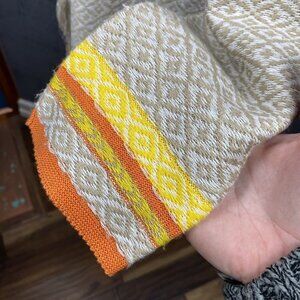 3/4 sleeve. Taupe and white square all over pattern with contrast orange and yellow trim. Front open cardigan sides have taupe fringe. 100% acrylic. Size large.