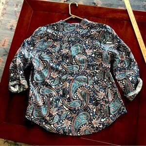 Stylish paisley button down shirt. Features vibrant blue paisley patterns. Perfect for casual wear. Buttoned roll up quarter sleeves. Preowned. Gently worn. Pit to pit measures 21 and length measures 25”.