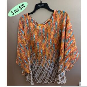 EUC stylish poncho blouse with vibrant orange, blue, and tan diamond pattern. Lightweight and flowy design. 100% polyester.