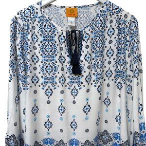 Ruby Rd. Peasant Top Size Medium Blue White Boho Long Sleeve Womens Blouse