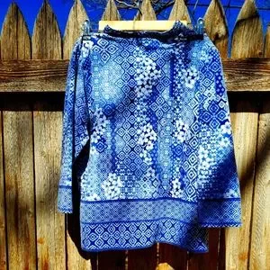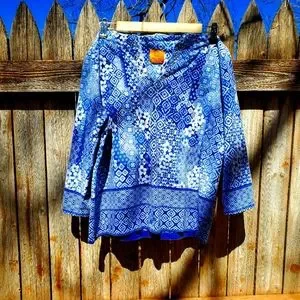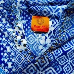 Three-quarter sleeve summer top from Ruby Rd. Petite. So pretty in faded blues and whites. Silver appliques line the deep v neckline. Size petite large. In beautiful vintage condition. There is only one flaw, a tiny mark on the back that is not noticeable unless someone was looking for it. ♡