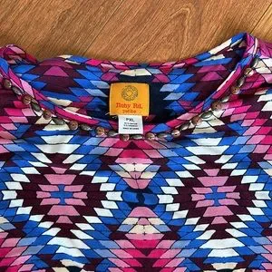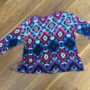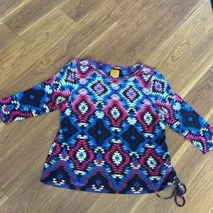 This is a gently worn top. Multi colored petite xl. Subtle beads accenting neckline. Colors are blue black pink and rose. All blended into pattern.
