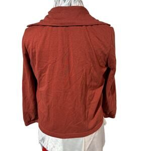 This is a Ruby Rd. petite jacket featuring a rust color and quilted detailing. It has a zip-up front with additional zippered pockets, offering both style and functionality.