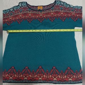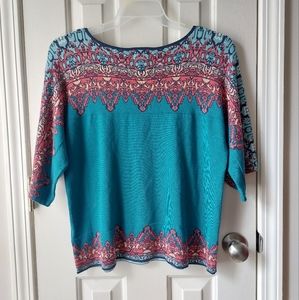 Ruby Rd. petite XL sweater blue & red blouse with geometric, tribal design. Very soft and beautiful, in great condition. There is one small stain on the front, not sure where it came from as I never wore this blouse. There are also some small unknown white marks that should come off with washing. See photos for details. - Armpit to armpit: 20" - Shoulder to hem: 24" - Sleeve length: 10.5" - Smoke/pet free - 90% Rayon/10% Nylon
