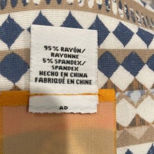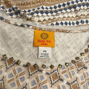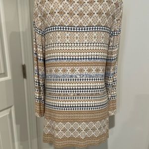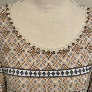 Super soft fabric, embellished neckline, blue, tan and white. Measures 18” across bust and 26” down, angled sleeves and hem with side splits. Excellent condition 🩵