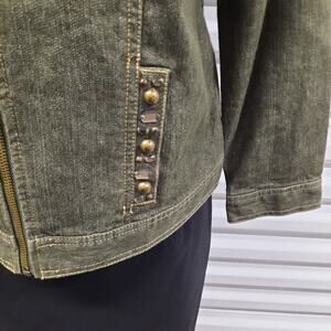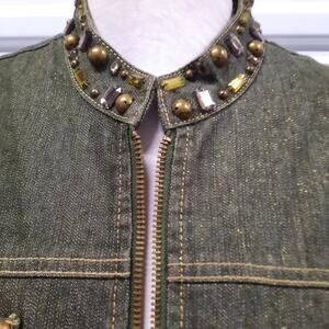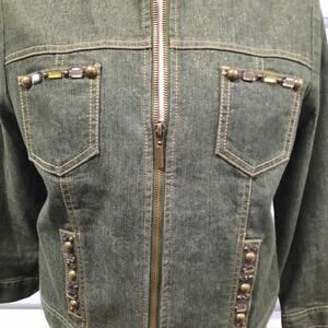 Ruby Rd Petite Womens Beaded Denim Jacket Olive Zip Embellished Boho Western Size 10P