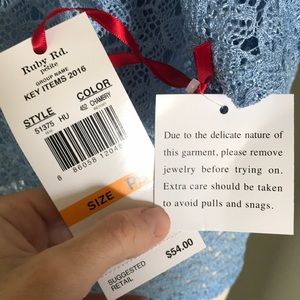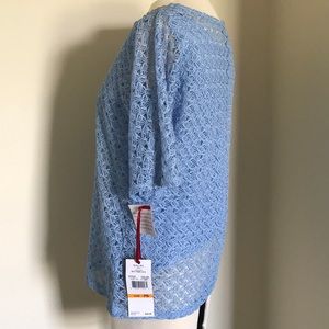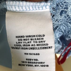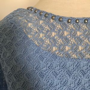 Light blue lace top with beautiful beading detail at neckline. Matching light blue tank lines the lace. Shirts are connected at top of shoulder