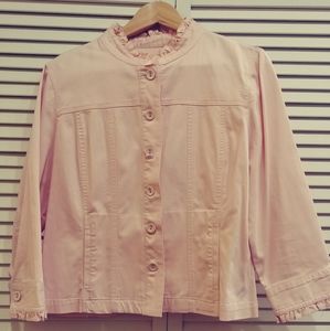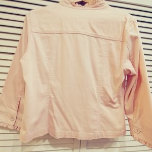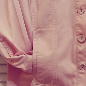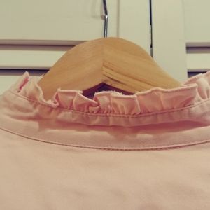 Beautifully made with polished cotton and delicate ruffles along the collar and sleeves. Nice design with vertical stitching, three quarter length sleeves and two pockets. Lightweight.