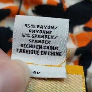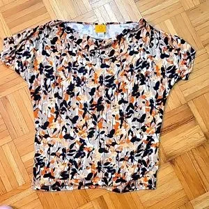 Orange, navy, peach, and tan top.. drape style neck and ruched sleeves. Soft and stretchy. Gently worn and nonsmoking home.