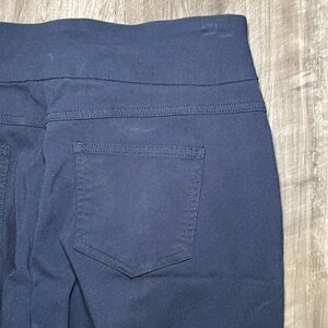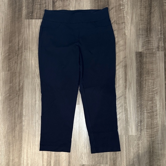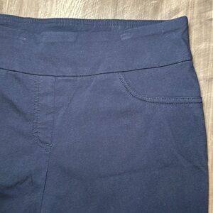 Item is preowned. Color is Navy. Material is Rayon (78%), Nylon (19%) and Spandex (3%). Size is a Women’s 12 (Measures 32).
