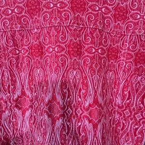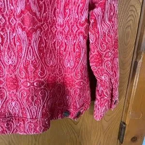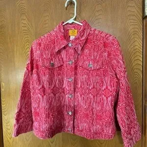 Stylish red jean jacket by Ruby Rd. Features intricate embroidered pattern. Button-up front with chest pockets. Perfect for casual wear. It has stamped silver metal buttons closing the front and the 2 chest pockets.