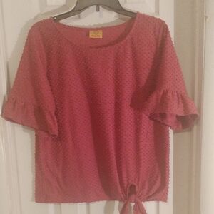 Stylish red top with textured fabric. Features short sleeves and a tie detail. Perfect for casual outings.