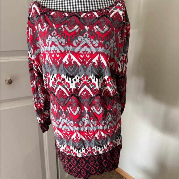 Chic top with a bold red and gray design. Ideal for everyday wear. Pit to pit 18 inches.