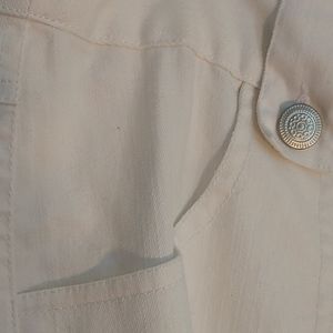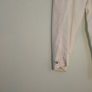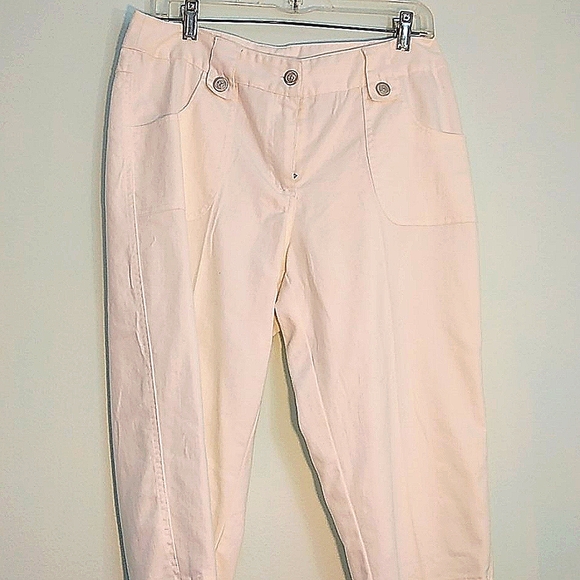 Five waist tab, leg tab capris in jean weight fabric. Waist -34, front rise-10, inseam-19, hem-18. Retro style. Four pocket.