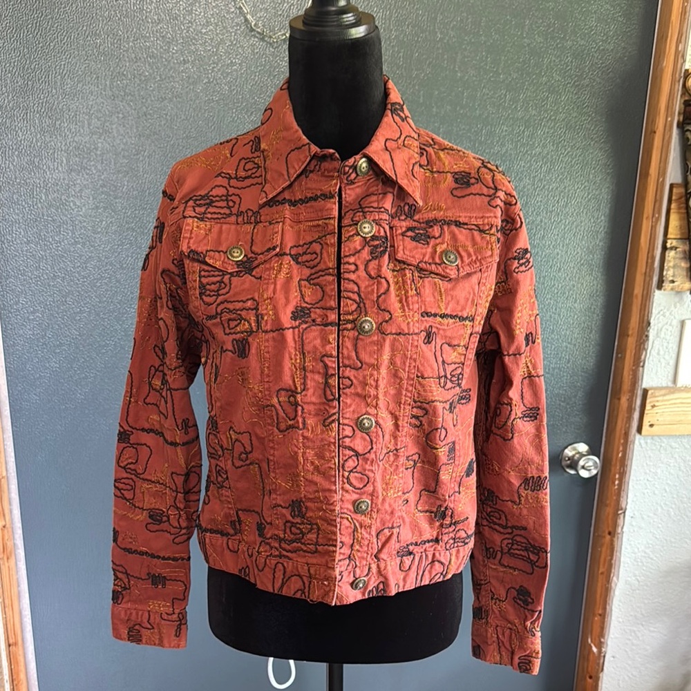 Ruby Rd. jacket in a rich rust color. Features an abstract pattern. Ideal for a bold fashion statement. S/M, no stains or holes