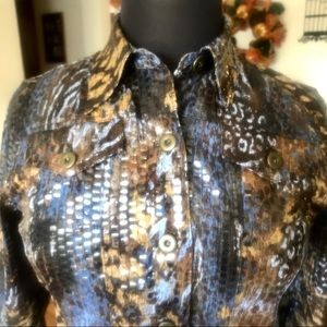 Beautiful jean jacket styling. Clear sequin overlays colors of brown, tan, navy and lighter blue. Bronze buttons. Approx. 20” x 21”. Sleeve 20”. Petites.