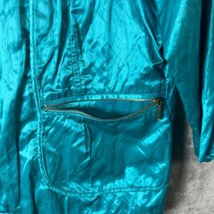 Vibrant aqua jacket with a glossy finish. Features practical pockets and a zip front. Ideal for a stylish, functional look.