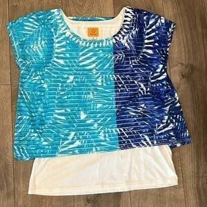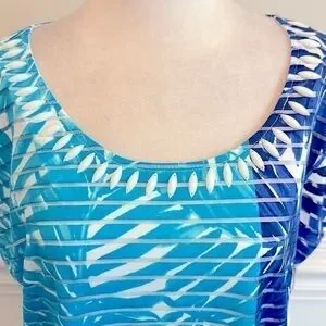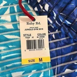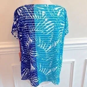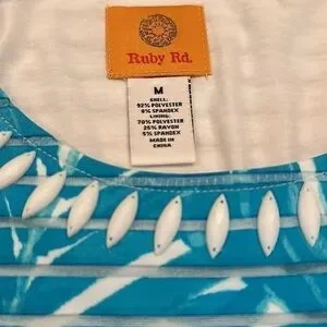 Ruby Rd. Shirt. Aqua, navy blue and white design. White beading on neckline. Sheer top with white layer underneath. Pit to pit is approximately 19 inches on the white undershirt and length is approximately 25 inches. Outer layer of shirt pit to pit is approximately 22 inches and length is approximately 22 inches. New with tag.