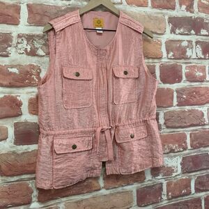 ▪️ Women’s Shirt Jacket: Scoop neckline, zipper and button front closure, tie waistline, cargo utility pockets, shimmery, crinkle crushed texture, lining and sleeveless. Pre-owned. Wear it with your favorite pants!